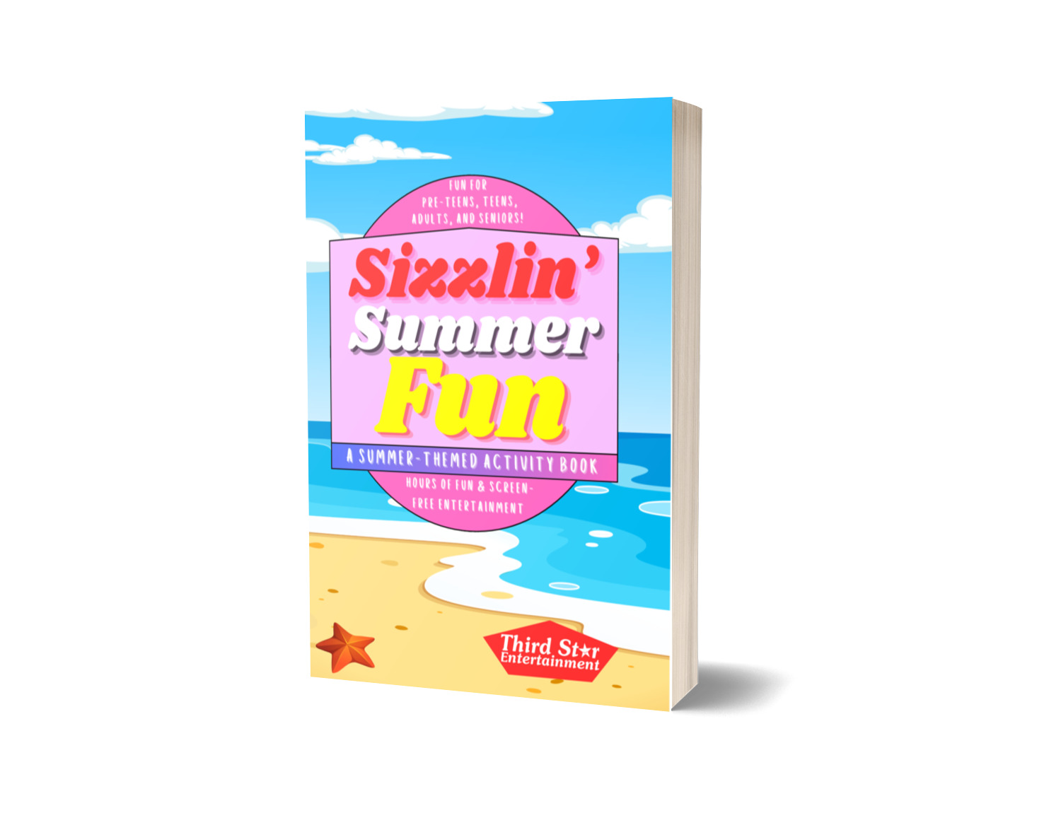 Sizzlin’ Summer Fun: A Summer-Themed Activity Book from Third Star Entertainment is here! Whether you’re lounging by the pool, relaxing indoors, or heading out on vacation, this exciting activity book is packed with hours of activity. This activity book is filled with a variety of puzzles, including crosswords, mazes, word searches, and more. Let your creativity shine with coloring pages and finish the image activities. All activities are summer-themed.